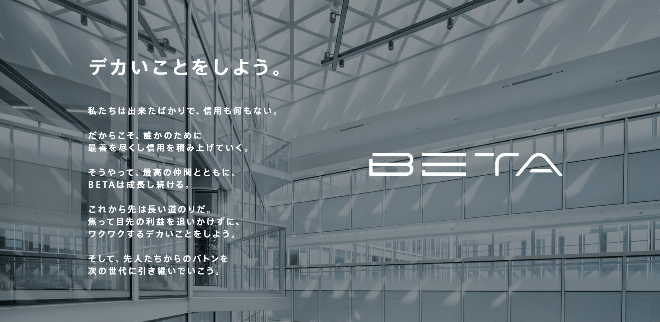 BETAは名古屋発のインターネットメディア・動画コンテンツの企画・開発・運営、マーケティングを行うベンチャー企業で、大手企業からの引き合いも多く、名古屋で最も勢いのある会社です。